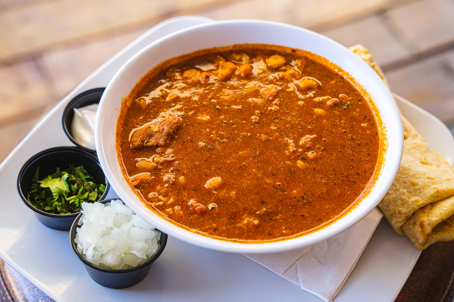 A traditional Mexican soup of slow roasted pork and hominy, corn tortillas and sour cream, diced onion and cilantro